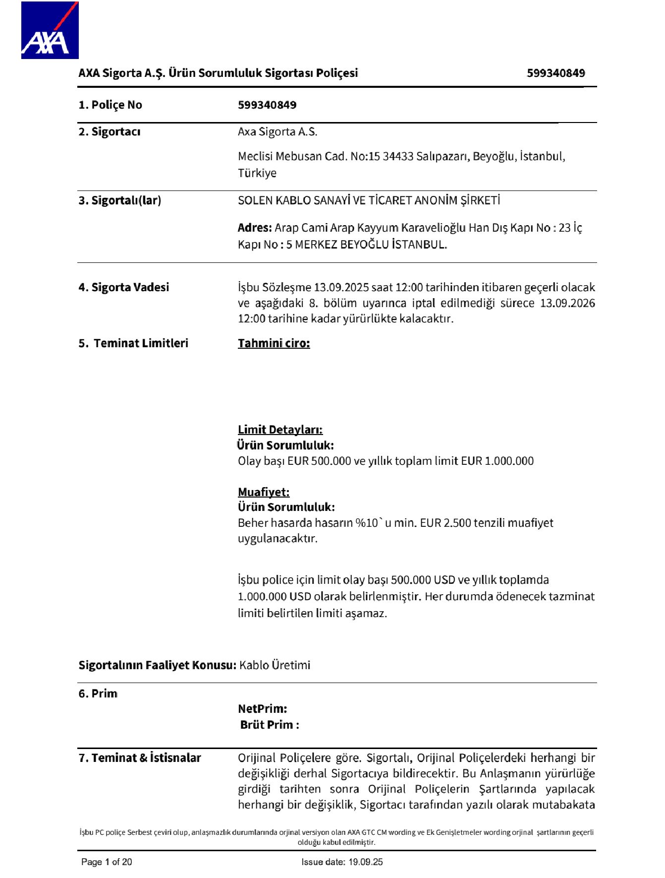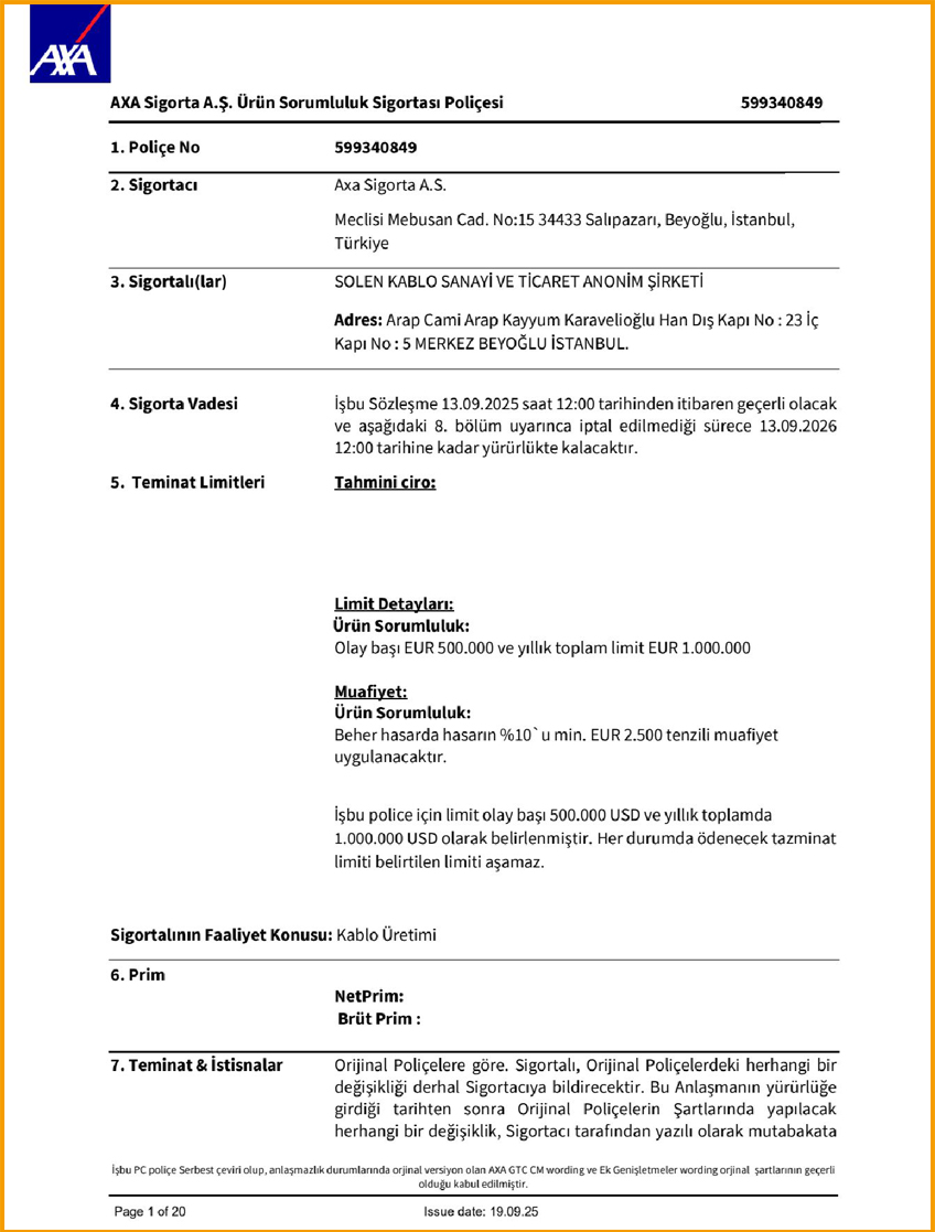 Ürün Sorumluluk Sigortası Solen Kablo, Ürün Sorumluluk Sigortası ile müşterilerini kullanıcı hataları dışında tarafımızca üretilen üründen kaynaklı karşılaşabileceği bedensel ve maddi zararlara karşı güvence altına almıştır.